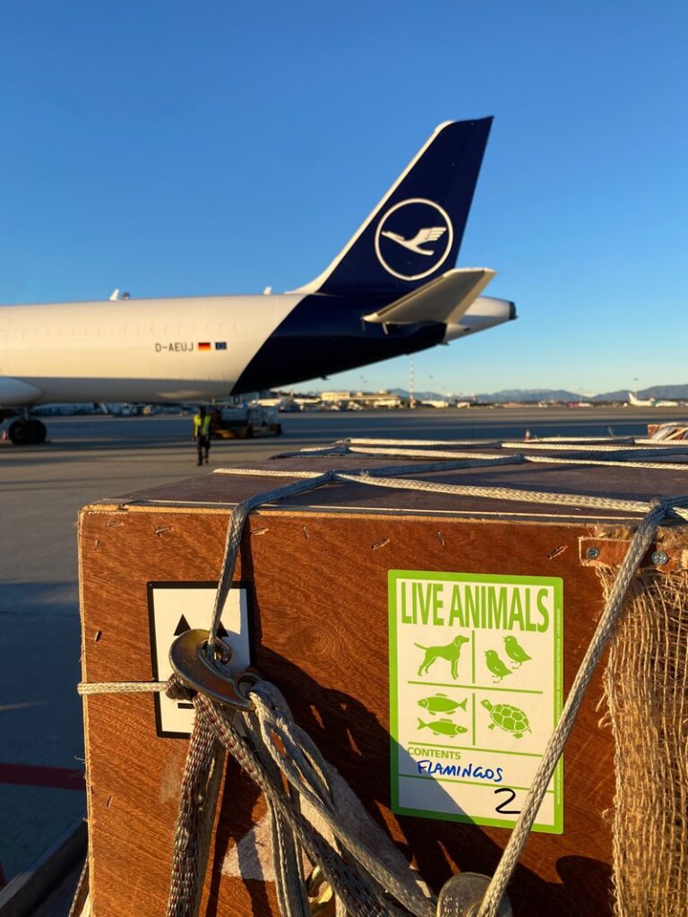 hanno viaggiato all’interno di casse apposite e debitamente aerate, dotate di abbeveratoio e cibo appropriato per la loro razza, ad una temperatura e luce per loro confortevole. Prima della partenza tutti gli esemplari sono stati controllati in aeroporto a livello veterinario e di tracciabilità dalla Guardia Forestale, che ha constatato che i fenicotteri rosa fossero in buona salute e potessero affrontare il viaggio”.