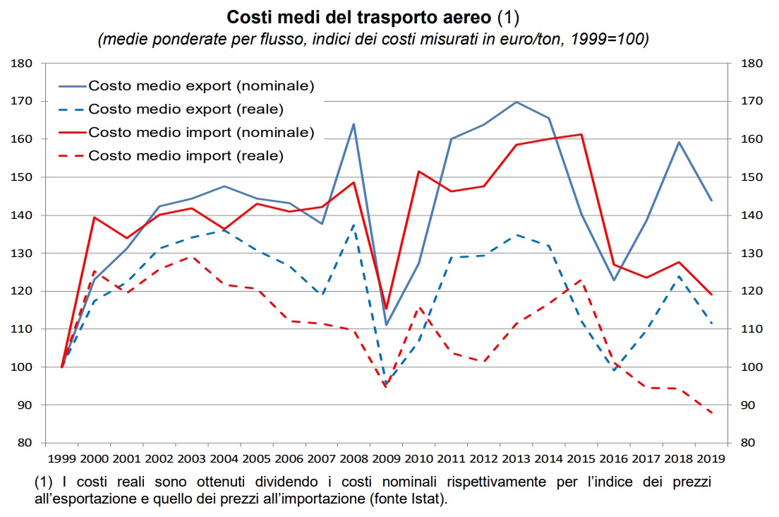 Incidenza del trasporto aereo sul valore delle merci altalenante in Italia