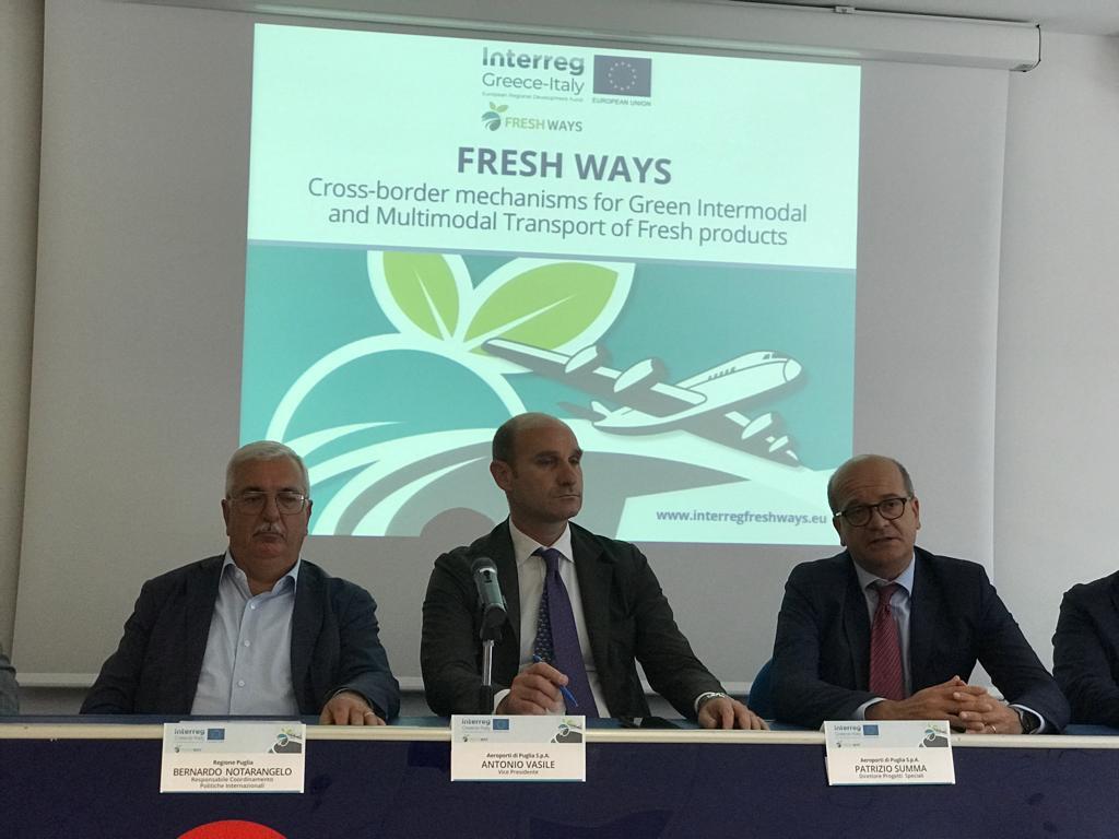 Nel dettaglio il progetto (al secolo: Cross-border mechanisms for Green Intermodal and Multimodal Transport of Fresh products – Fresh Ways), finanziato per oltre 2,6 milioni di euro dal programma Interreg V-A Grecia–Italia 2014-2020, e presentato ufficialmente questa mattina nello scalo pugliese, ha l’obiettivo sia di “accrescere il traffico di passeggeri fra Italia e Grecia” ma anche di sperimentare l’utilizzo di alcune delle stesse tratte destinate al traffico dei passeggeri anche a fini commerciali per il trasporto dei prodotti freschi (in particolari caseari e ortofrutticoli) attraverso un monitoraggio in tempo reale delle stive degli aerei.