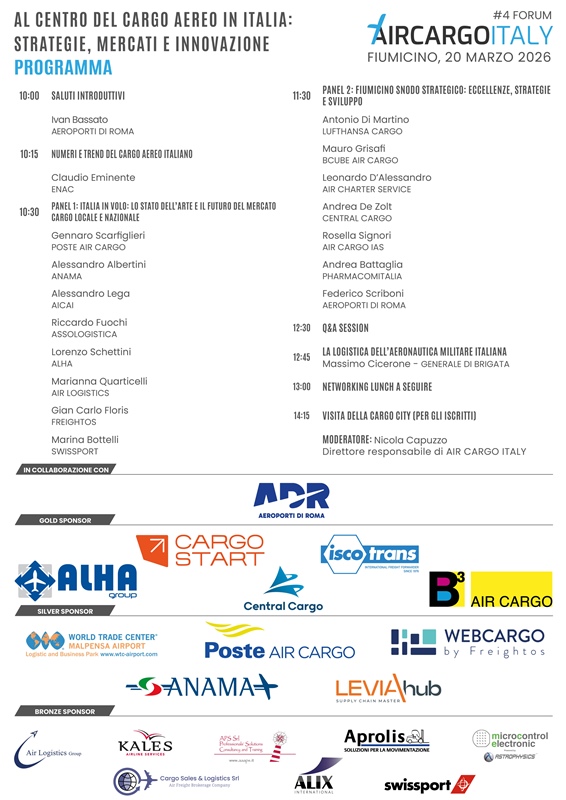 Anche Aeronautica Militare, Aeroporti di Roma, Lufthansa Cargo, Poste Air Cargo e vari altri stakeholder nei panel. Oltre 130 gli addetti ai lavori già accreditati