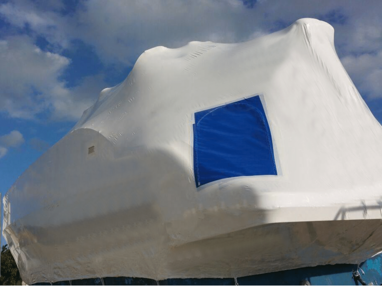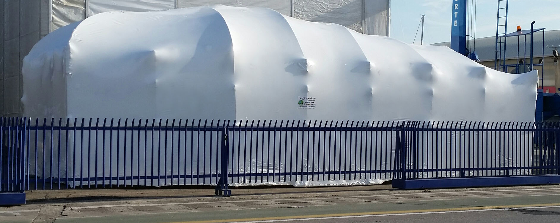 Il rivestimento ermetico e compatto si adatterà perfettamente alla sagoma. Inoltre, la copertura in polietilene termoretraibile è 100% riciclabile, viene realizzata in loco in tempi ridotti, ideale di conseguenza per urgenze ed imprevisti. Gli imballi sono completati con simbologia internazionale quali frecce, ombrello, baricentro, catene, bicchiere, stivaggio e stoccaggio. Una rete di protezione completa il tutto, per garantire maggiore sicurezza alla copertura.