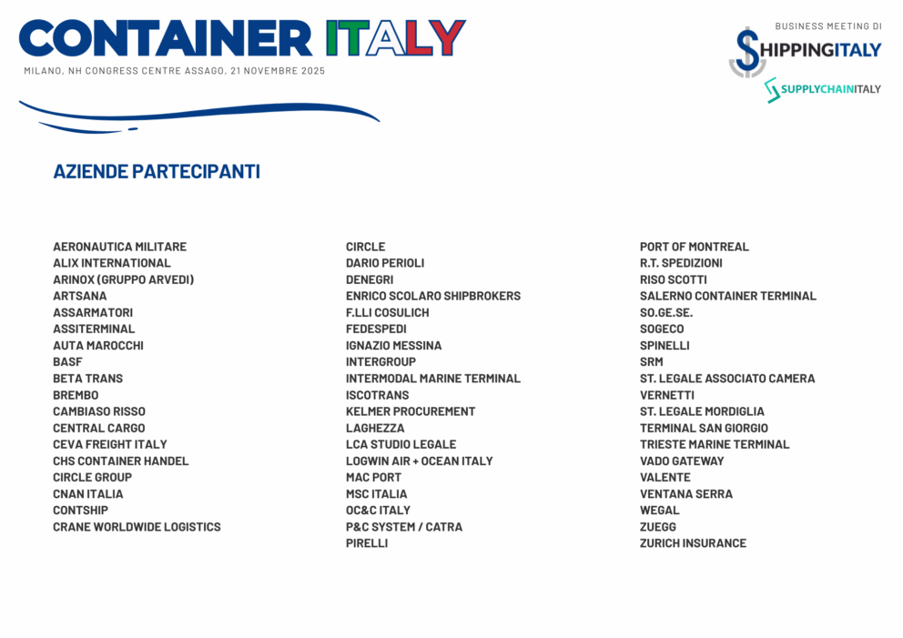 Dopo il successo ottenuto nei giorni scorsi a Mestre dalla seconda edizione di BREAK BULK ITALY, la redazione di SHIPPING ITALY è al lavoro per rendere altrettanto efficace e apprezzato anche il prossimo appuntamento in programma il prossimo 21 novembre: CONTAINER ITALY. Al NH Milano Congress Centre di Assago torna infatti il Business Meeting intitolato quest’anno “La catena del valore nel trasporto container: strategie, innovazione, competitività” e organizzato per proporre un utile momento di confronto e di networking fra gli attori che rappresentano e animano la domanda e l’offerta di trasporti e spedizioni di carichi containerizzati da e per l’Italia.