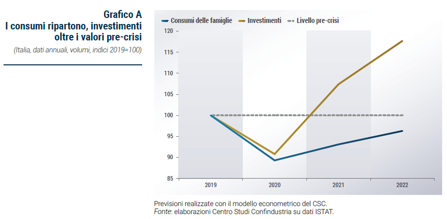 Secondo Confindustria “questa robusta ripartenza del Pil, pari a oltre +10% nel biennio, dopo il quasi -9% del 2020, riporterebbe la nostra economia sopra i livelli pre-crisi nella prima metà del 2022, in anticipo rispetto alle attese iniziali. Sebbene il recupero stia procedendo più spedito che altrove, il gap rispetto al pre-pandemia è, al momento, ancora più ampio di quello degli altri principali partner perché la caduta del 2020 in Italia è stata maggiore (nel II trimestre 2021 era del -3,8% sul IV 2019, in Germania del -3,3%, in Francia del -3,2% mentre gli USA hanno raggiunto già il livello pre-crisi nel II trimestre 2021). A partire dal IV trimestre del 2021 l’espansione del Pil si attesterà su un profilo più moderato.