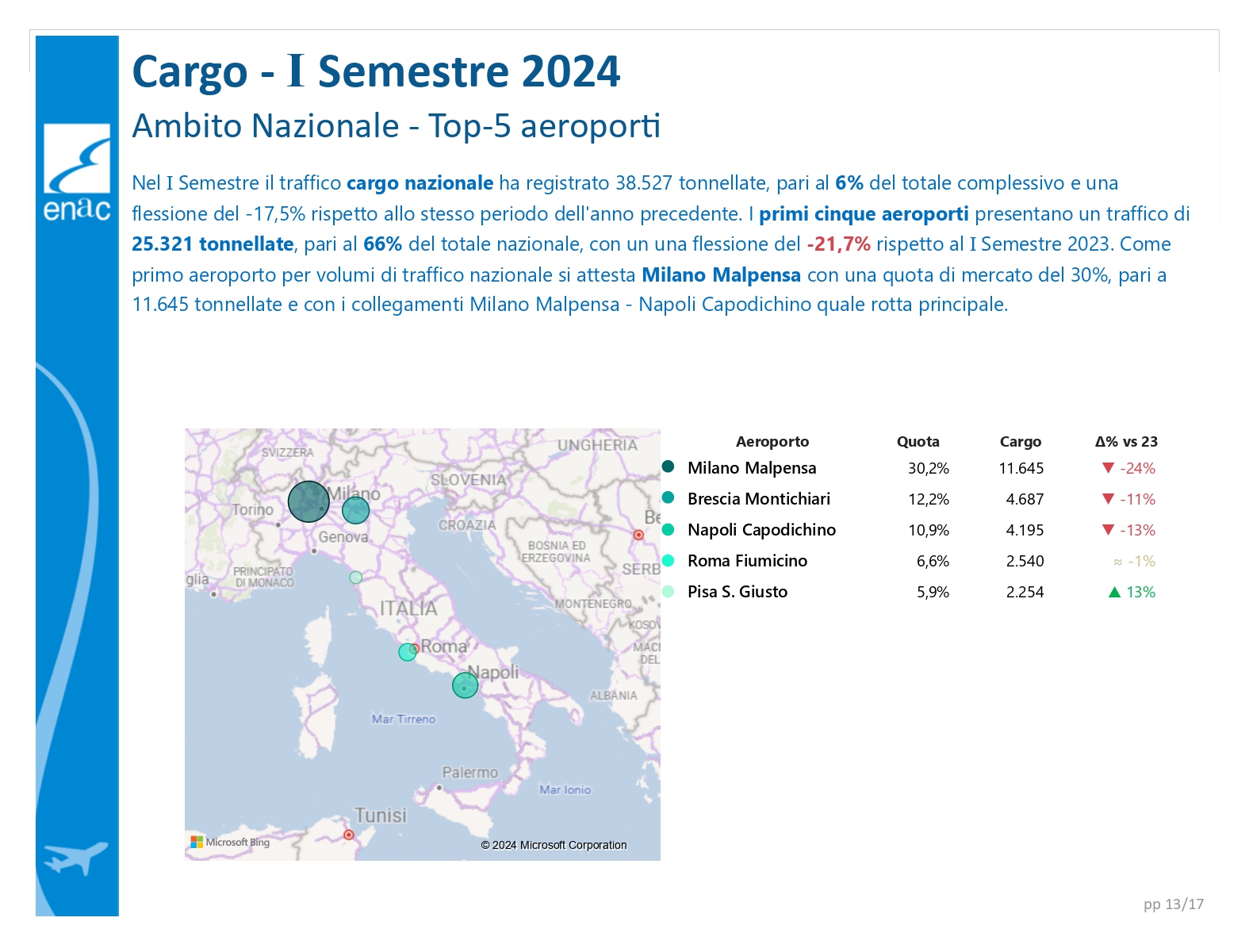 In ambito esclusivamente nazionale il traffico cargo ha registrato 38.527 tonnellate, pari al 6% del totale complessivo e una flessione del -17,5% rispetto allo stesso periodo dell’anno precedente. I primi cinque aeroporti presentano un traffico di 25.321 tonnellate, pari al 66% del totale nazionale, con un una flessione del -21,7% rispetto al I Semestre 2023. Come primo aeroporto per volumi di traffico nazionale si attesta Milano Malpensa con una quota di mercato del 30%, pari a 11.645 tonnellate e con i collegamenti Milano Malpensa – Napoli Capodichino quale rotta principale.