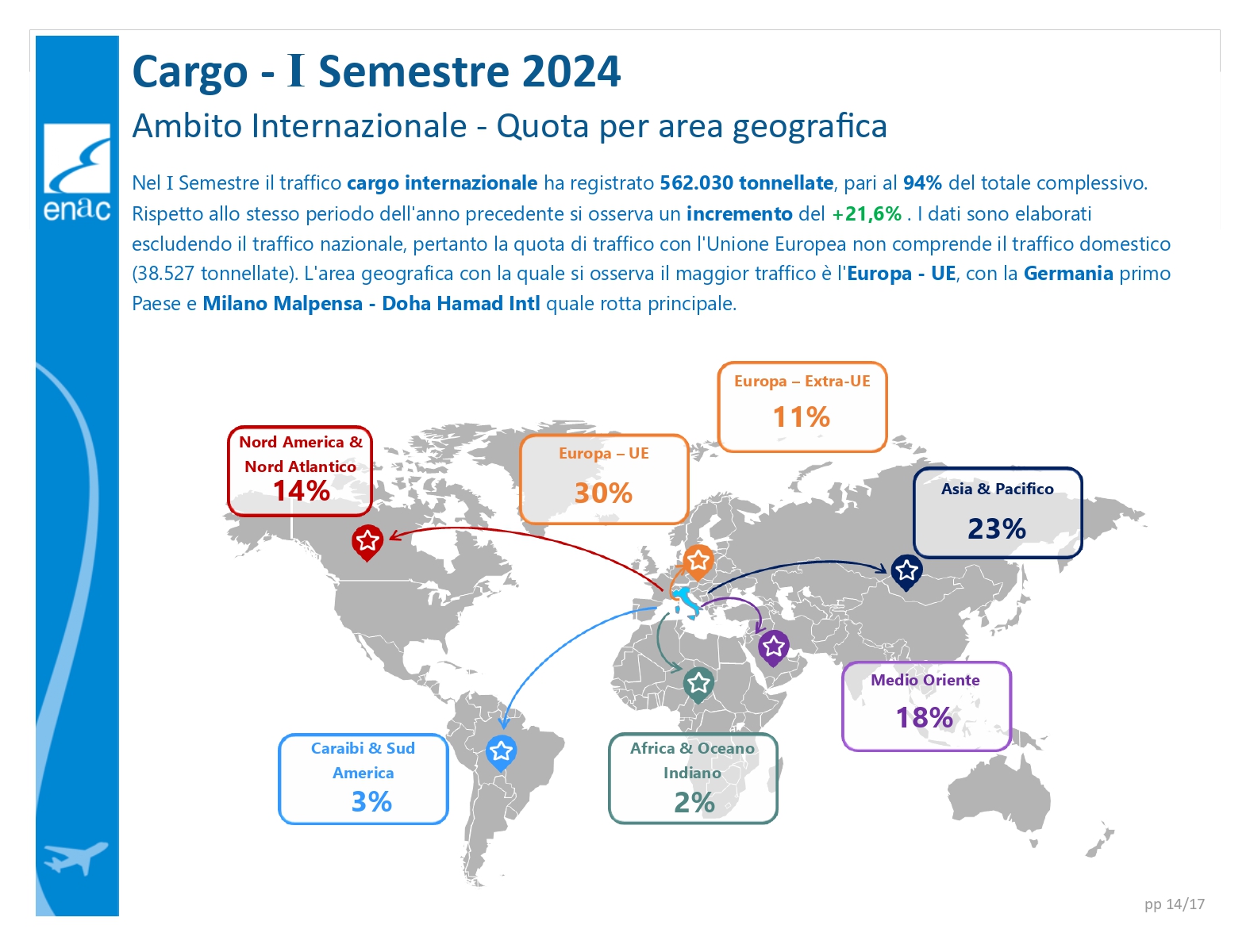 Nello stesso periodo il traffico cargo internazionale ha invece registrato 562.030 tonnellate, pari al 94% del totale complessivo. Rispetto allo stesso periodo dell’anno precedente si osserva un incremento del +21,6% . I dati sono elaborati da Enac escludendo il traffico nazionale, pertanto la quota di traffico con l’Unione Europea non comprende il traffico domestico (38.527 tonnellate). L’area geografica con la quale si osserva il maggior traffico è l’Europa – UE, con la Germania primo Paese e Milano Malpensa – Doha Hamad Intl quale rotta principale.