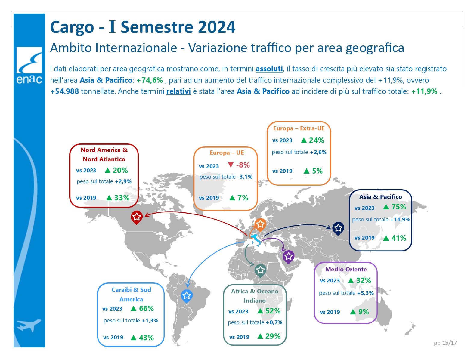 Significativo incremento del traffico aereo registrato dall’Enac in Italia nel primo semestre del 2024 rispetto allo stesso periodo del 2023: l’aumento è stato del +12% nel numero di passeggeri e del +18% nel comparto cargo, con conseguente superamento dei volumi pre-Covid (2019).