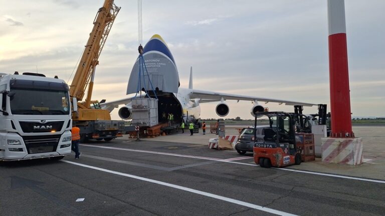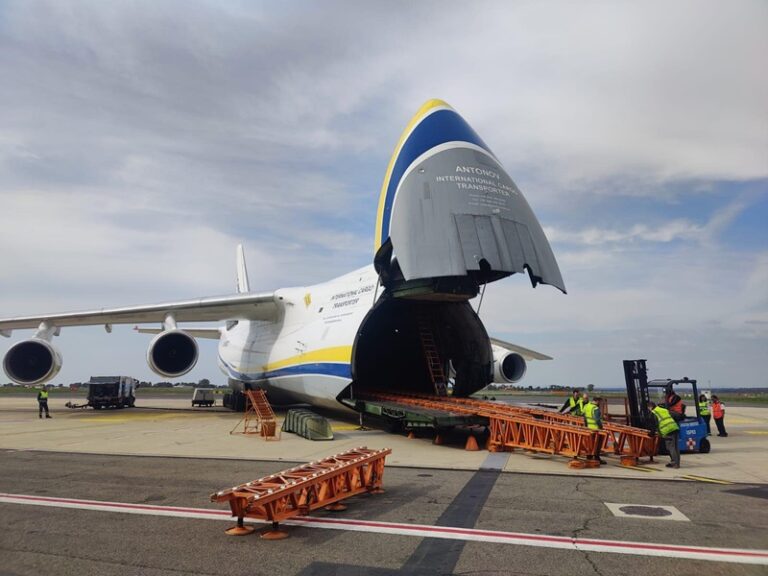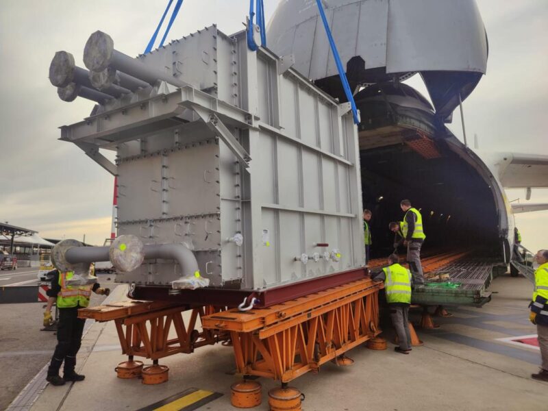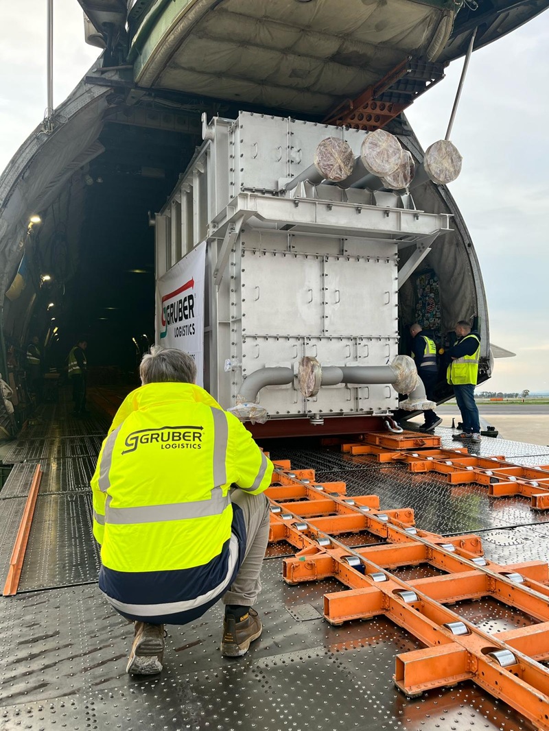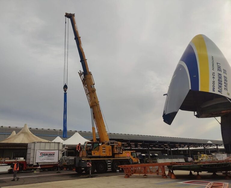 Nel dettaglio lo scambiatore è stato trasportato fino all’aeroporto di Roma Fiumicino, per il carico su un An124-100. Nell’operazione Antonov Airlines ha collaborato con Air Partner. Considerati il peso – oltre 20 tonnellate – e le dimensioni della struttura (6,50 x 2,50 x 3,60 metri), il trasporto ha richiesto una pianificazione specialistica e l’impiego di mezzi ad hoc. Dopo l’arrivo nello scalo, sono state svolte le operazioni di sniffer e controllo di sicurezza prima che fosse garantito al mezzo di Gruber l’accesso alla pista. Per il caricamento, sono stati utilizzati una rampa esterna fornita da Antonov Airlines e una gru dedicata; lo scambiatore è stato poi sistemato su un telaio metallico dove sono stati inseriti 4 extra grilli da 17WLL per l’ancoraggio all’interno dell’An124. Le operazioni di handling si sono svolte con Alha, cui Gruber ha voluto dedicare un “ringraziamento particolare” per la collaborazione ricevuta.